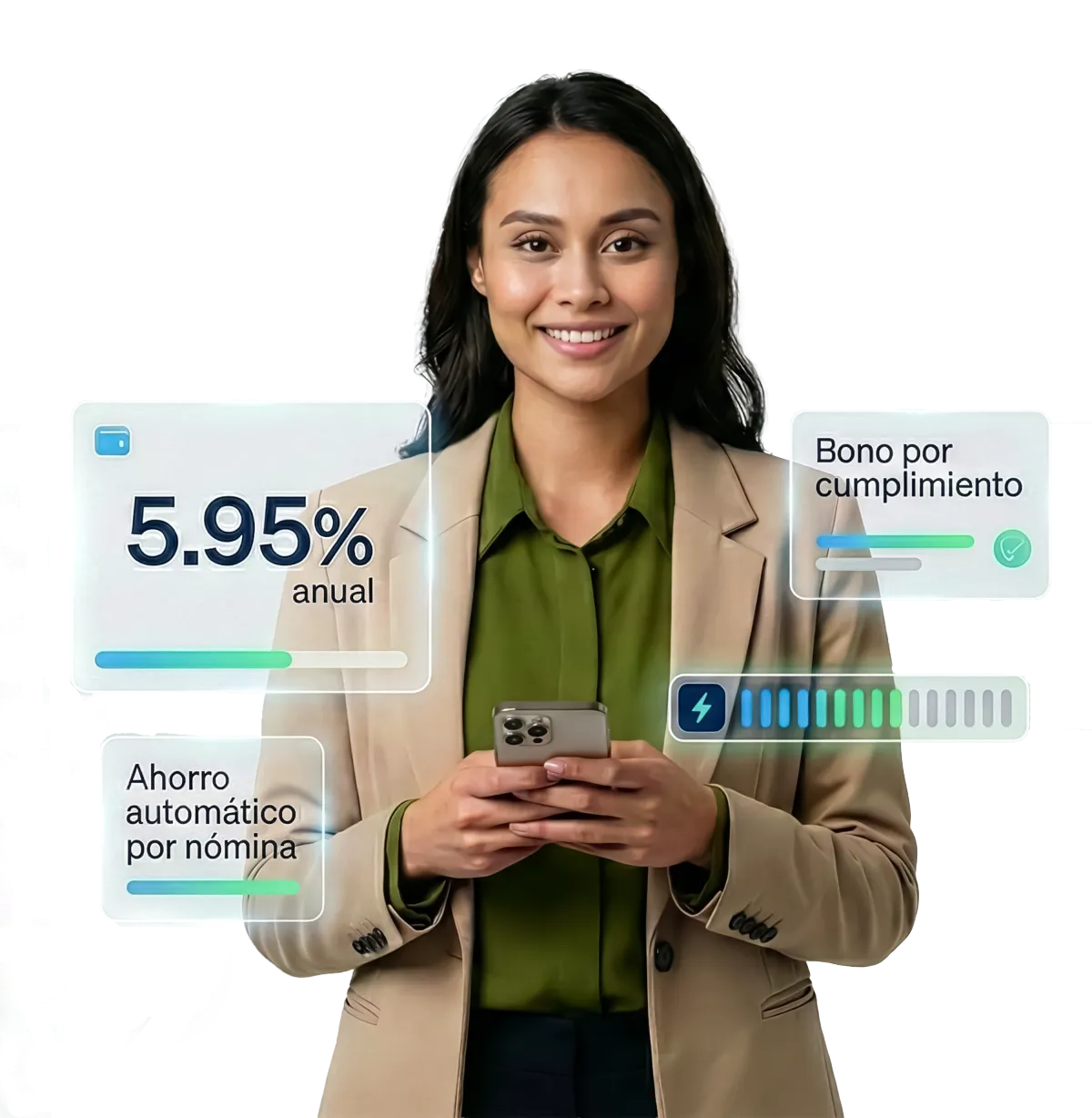 Tasa competitiva de 5.95% anual. Cada mes tus intereses se suman y crecen. El ahorro genera un rendimiento competitivo que permite al colaborador ver crecer su dinero de forma constante